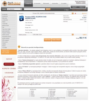 ■ Funtech (www.funtech.si). Funtech je še eden izmed domačih trgovcev, ki z dobrim delom izstopajo iz povprečja. Tudi po inovativnosti. V spletni prodajalni trgovine Funtech so namreč kupcem kot pomoč pri nakupu namenili pameten konfigurator računalniških komponent, ki »ve«, katere komponente sodijo skupaj in katere ne. Tako se lahko poslovimo od napak, povezanih z izbiro osnove plošče, pomnilnika in procesorja, ki sodijo med najpogostejše. Za nameček konfigurator skrbi tudi za zadovoljstvo uporabnika, saj prikazuje le izdelke, ki so na zalogi v trgovini ali pri dobaviteljih, zato je končni rezultat računalnik, ki ga uporabnik dejansko lahko kupi. Zgledno v več pogledih. Zanimiv je tudi pogled na storitve, ki jih podjetje ponuja, saj se med njimi najdejo tudi možnosti, kot so vgradnja sistema vodnega hlajenja v računalnik, nega računalnika, utišanje računalnika, navijanje računalnika in podobno.