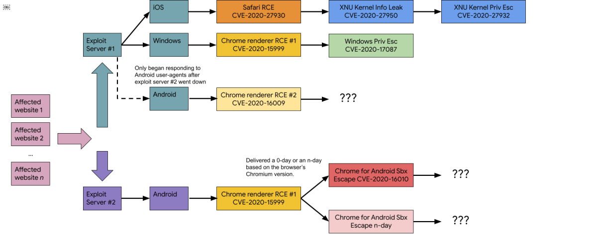 Google je v začetku leta odkril, da neznani napadalci izkoriščajo kar 11 ranljivosti v različni programski opremi, ki teče na iOS, Androidu in Windows. V obsežnih objavah na blogu je skupina Project Zero, ki se v Googlu ukvarja z iskanjem lukenj v programski opremi vseh proizvajalcev, ne le Googla, natančno popisala ranljivosti. Pri tem pa so zamolčali ključno podrobnost, ki jo je njihova Threat Analysis Group poznala. Omenjenih ranljivosti niso zlorabljali običajni hekerji, temveč obveščevalci ene izmed ameriških zahodnih zaveznic.