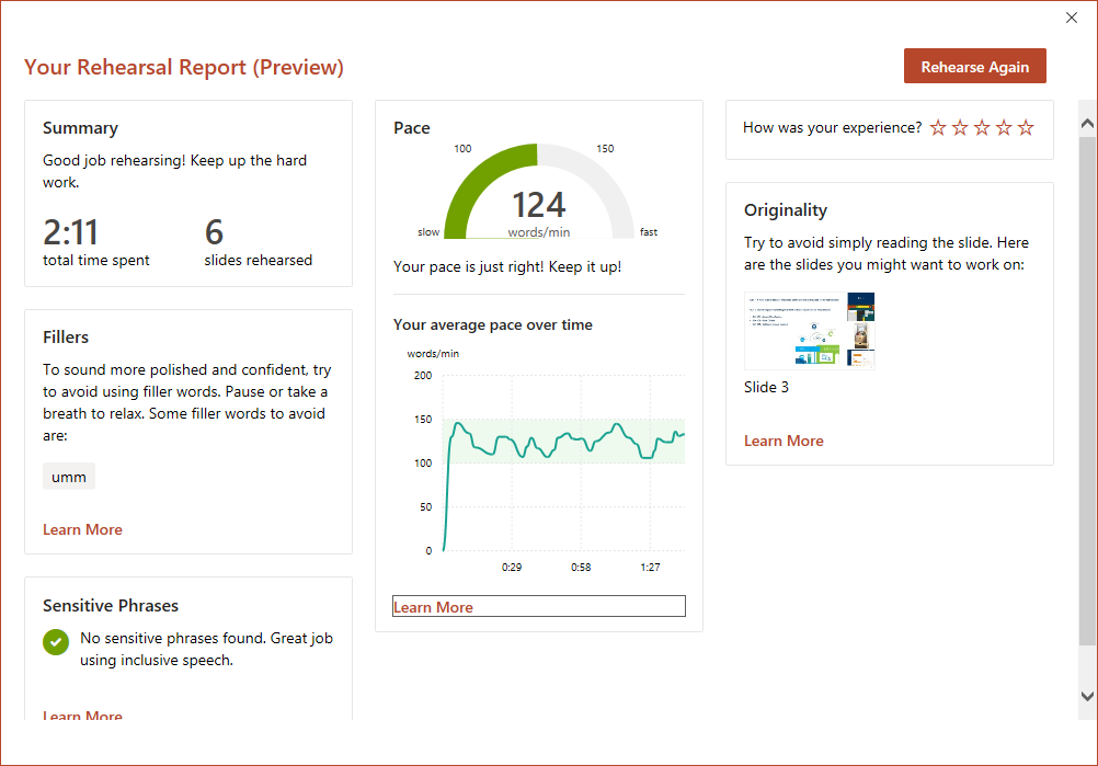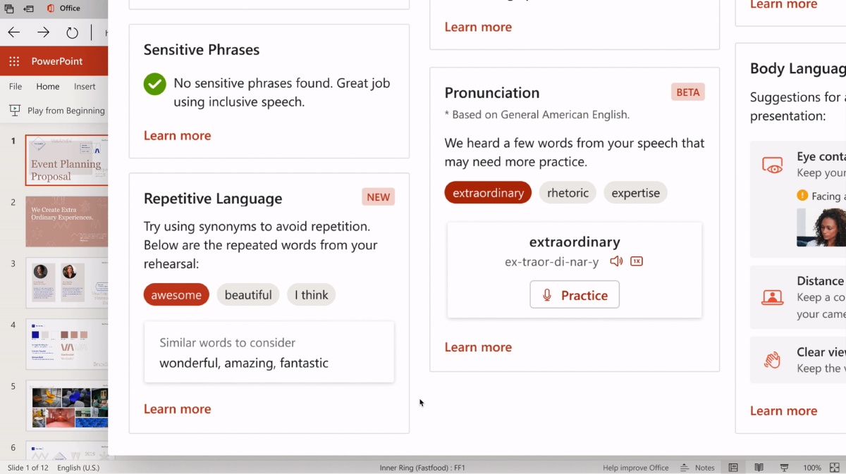 Microsoft je v najnovejši paket posodobitev za Office 365 prinesel nadvse zanimivo novost, ki bo koristila vsem, ki želijo izboljšati kvaliteto svojih predstavitev s pomočjo PowerPointa. Microsoft PowerPoint Presenter Coach je programsko orodje, pravzaprav trener, ki zna spremljati uporabnikove vaje za predstavitve in svetovati, kako odpraviti najpogostejše napake ter izboljšati kvaliteto predvajanja.