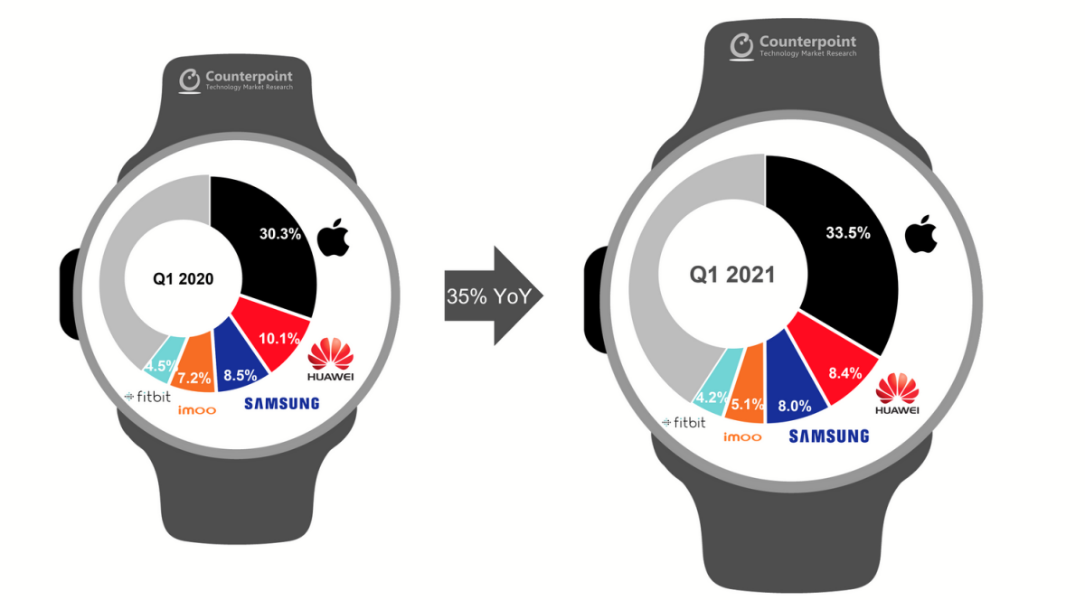 Po analizi podjetja Counterpoint Research se je globalna prodaja pametnih ur v prvem četrtletju dvignila kar za 35% - največji je Apple, sledi Huawei, a ga Samsung dohiteva.
