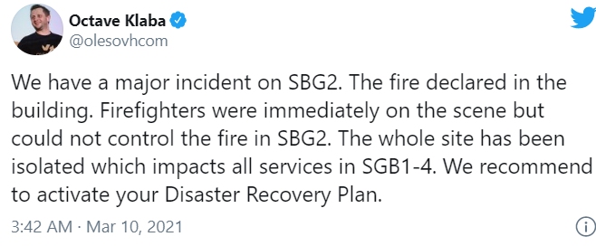 Požar v eni izmed strežniških sob se je začel danes ponoči ob 0:47. Do 4h zjutraj je požar kjub ukrepanju gasilcev uničil podatkovni center, upravljalci do njega tudi nimajo več fizičnega dostopa. Podjetje OVHCLoud je največji evropski "oblak" in ima v Evropi 15 podatkovnih servisov, kakšne točno so/bodo posledice tega požara, pa bodo še raziskali in obvestili stranke in javnost. Uničen je center SBG2, zaradi varnosti so ugasnjeni in nedostopni tudi centri SBG1, SBG3 in SBG4 in danes ne bodo zagnani.